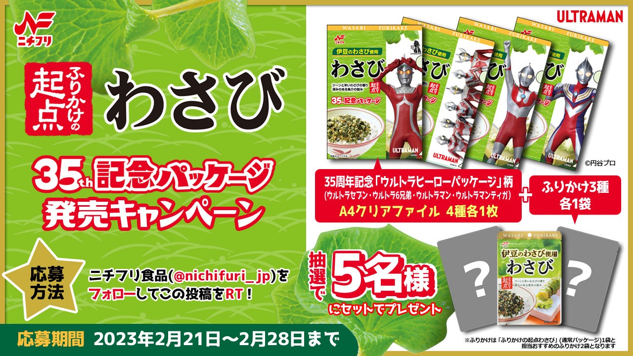 ニチフリ食品 株式会社(本社:静岡県静岡市、代表取締役社長:塩坂 恵理子)は、「ふりかけの起点わさび」発売35周年を記念し、ウルトラヒーローがデザインされた「ふりかけの起点わさび」(35周年記念パッケージ)を2023年3月13日(月)より数量限定で発売いたします。