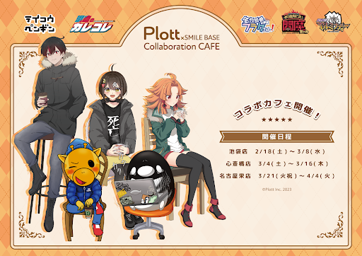 株式会社Plott(本社:東京都渋谷区、以下Plott)は、株式会社SMILE BASEとコラボレーションし、Plottが制作・配信するYouTubeチャンネル「テイコウペンギン」「混血のカレコレ」「全力回避フラグちゃん!」「秘密結社ヤルミナティー」「¥満解決!閻魔ちゃん」の描き下ろしイラストを使用したオリジナルグッズやキャラクターをイメージしたコラボメニューを販売いたします。