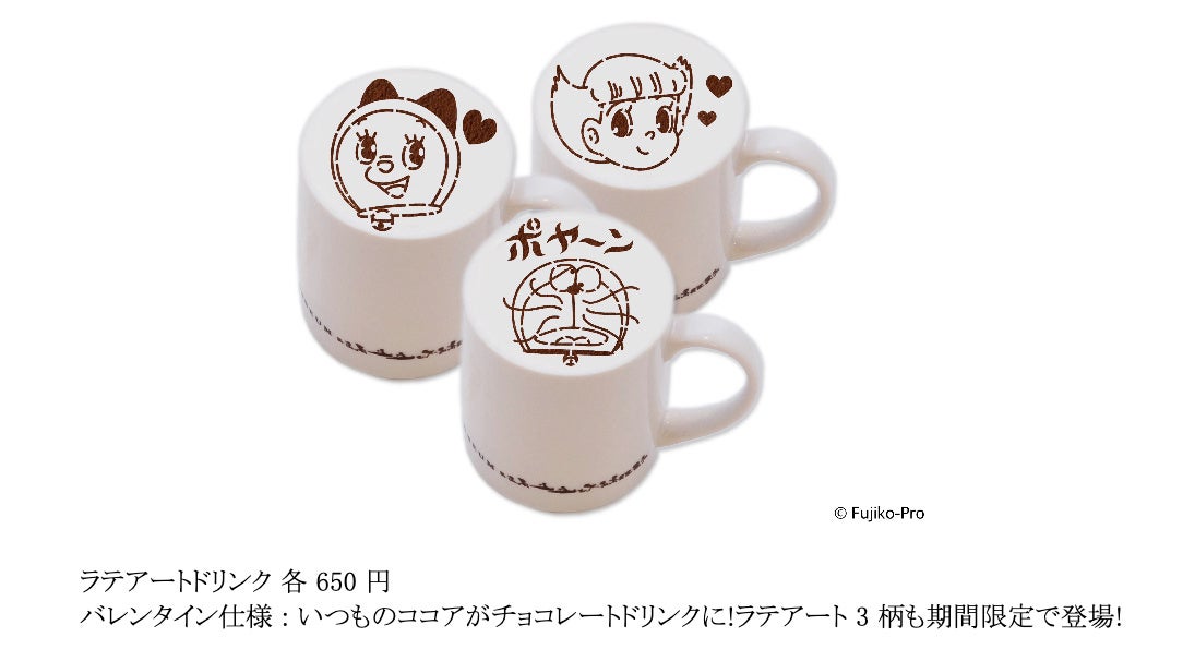 そして、ミュージアムショップ、ミュージアムカフェ、ギフトコーナー「藤子屋」では新商品、 新メニューが登場しました。ミュージアムカフェでは、ラテアートドリンクにチョコレートが登場、 さらに、エスパー摩美やドラミちゃんなど 3 種のラテアートを追加し、バレンタイン仕様に。