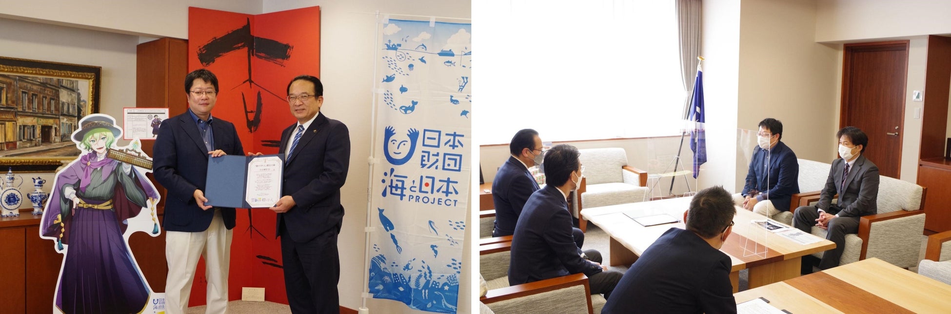 燈の守り人キャラクターを活用して、地域の灯台を歴史・文化資産として活用する機運をつくるため、キャラクター化の対象となる「立石岬灯台」が立地している福井県敦賀市の渕上隆信市長を、「燈の守り人」製作委員会プロデューサーの柴田英知が2023年2月6日(月)に表敬訪問し、キャラクターの贈呈式を実施しました。
