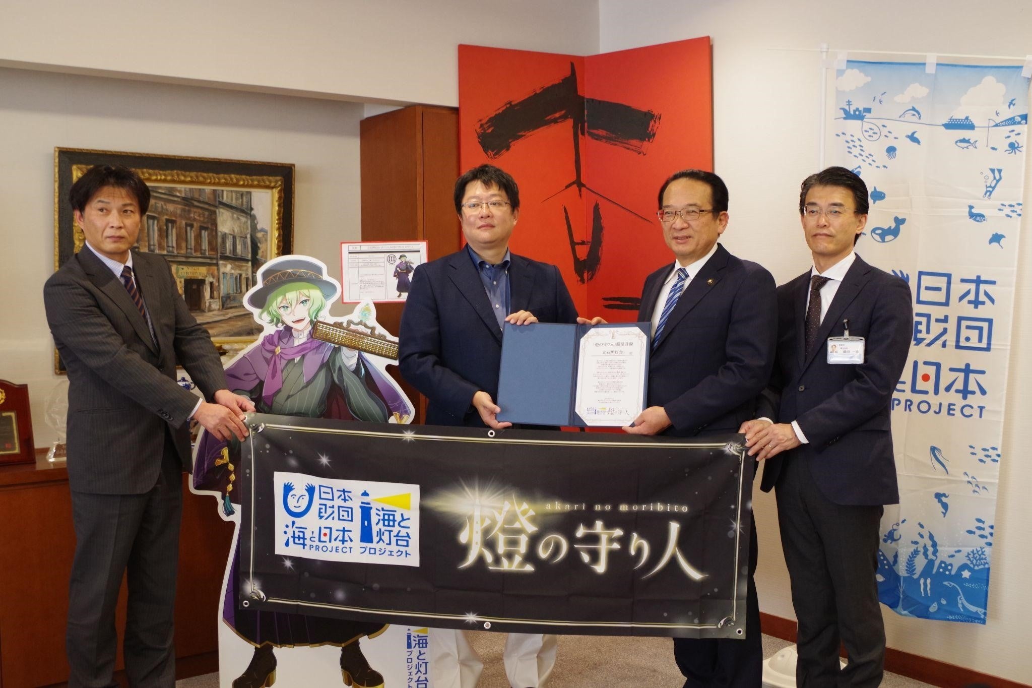 燈の守り人キャラクターを活用して、地域の灯台を歴史・文化資産として活用する機運をつくるため、キャラクター化の対象となる「立石岬灯台」が立地している福井県敦賀市の渕上隆信市長を、「燈の守り人」製作委員会プロデューサーの柴田英知が2023年2月6日(月)に表敬訪問し、キャラクターの贈呈式を実施しました。