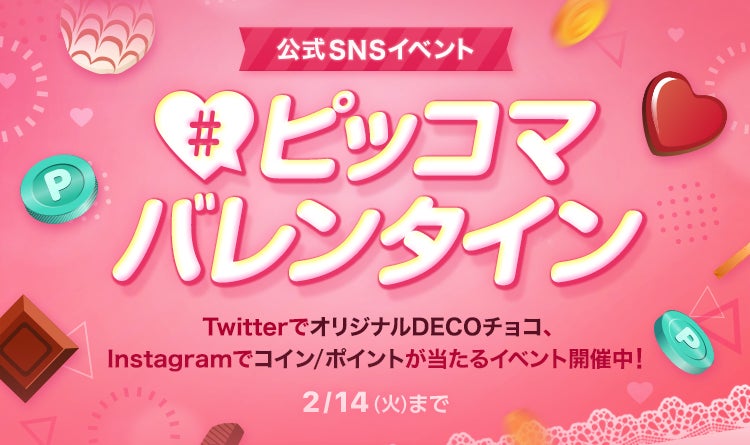 またピッコマ公式SNSアカウントではバレンタインイベント本日2/14(火)まで開催しております。SNSイベントはTwitterとInstagramで行われております。Twitterイベントでは、ピッコマ公式Twitterアカウントからバレンタインに関する投稿がされます。イベント参加条件として、まずピッコマ公式Twitterアカウントをフォロー、バレンタイン投稿をリツイートした後、コメント欄に答えを書き込んで頂いたユーザー様を対象に、抽選で14名様にピッコマオリジナルDECOチョコ10個入りセットをプレゼントいたします。Instagramイベントの参加方法は、まずピッコマ公式Instagramアカウント(piccoma_jp)をフォロー。投稿されたイベント投稿のコメントに好きなキャラのハート絵文字を投稿するだけです。ハート絵文字を投稿されたユーザーを対象にピッコマコイン/ポイントどちらかを1,000円分抽選で5名様にプレゼントいたします。