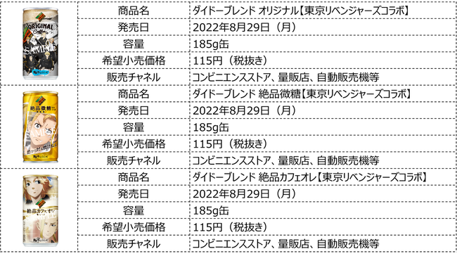 ダイドードリンコ株式会社は、人気TVアニメ「東京リベンジャーズ」とコラボした「ダイドーブレンド オリジナル」「ダイドーブレンド 絶品微糖」「ダイドーブレンド 絶品カフェオレ」の発売に合わせ、「限定グッズが当たる!珈琲抗争キャンペーン」を2月28日(火)まで展開しております。