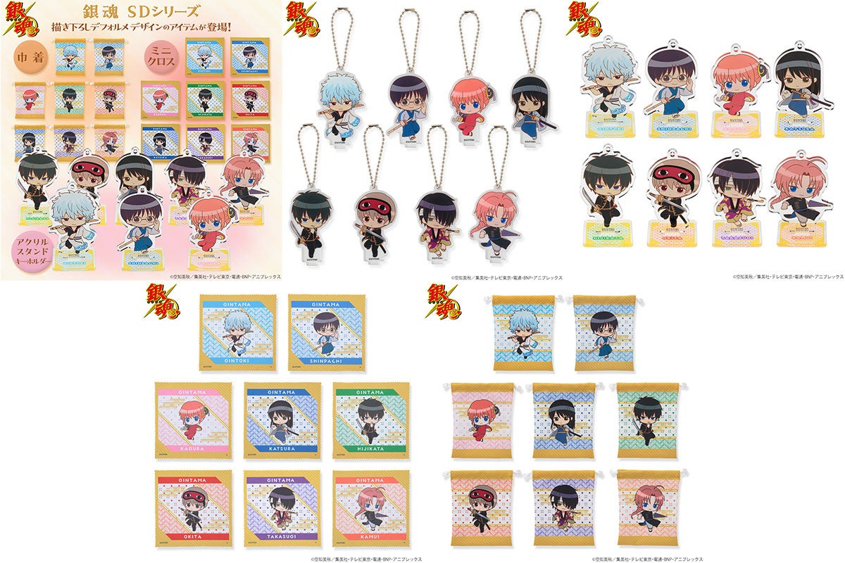 また、好評につき人気TVアニメ『銀魂』に登場するキャラクターたちのオリジナルデフォルメイラストをデザインしたSDシリーズも2月16日~再販決定いたしました。アクリルスタンドキーホルダー、ミニクロス、巾着の3商品を展開いたします。