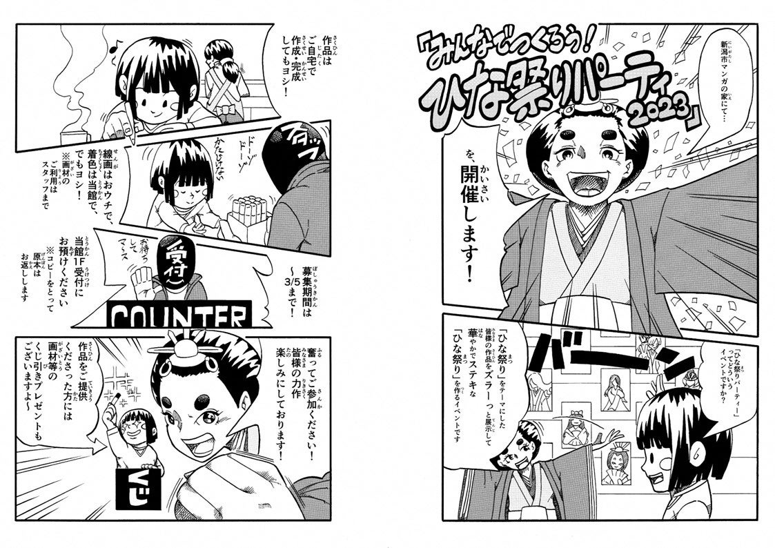 ひな祭り特別企画として、新潟市マンガの家では「みんなでつくろう!ひな祭りパーティ2023」を開催いたします!「ひな祭り」をテーマにした皆様の作品を当館・特設コーナーに展示して、華やかでステキな「ひな祭り」を一緒に作りましょう!