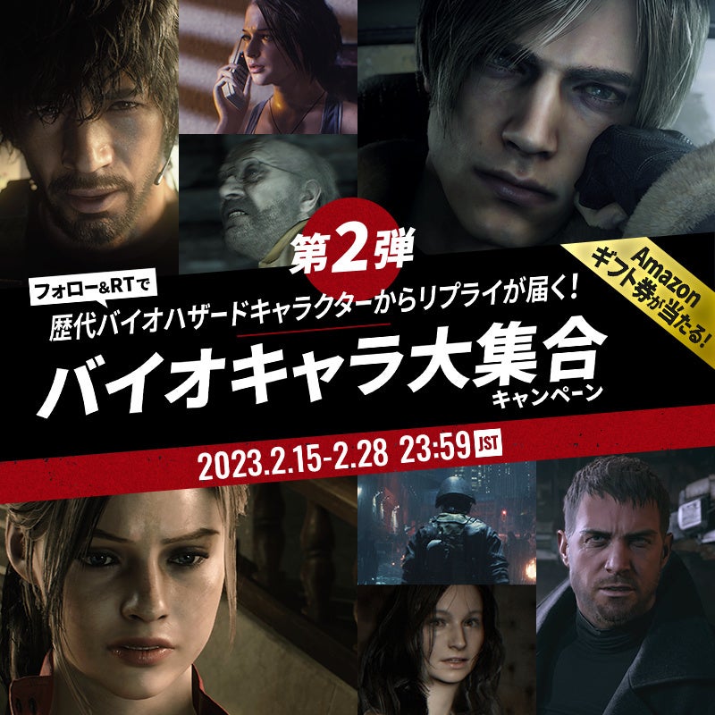 この度、バイオハザードのキャラクターの魅力をより多くの方にお届けするため、2月15日(水)より、昨年ご好評いただきました、抽選でAmazonギフト券1000円分(総額10万円分)がその場で当たる「バイオキャラ大集合!キャンペーン」第2弾をTwitter上で実施します。