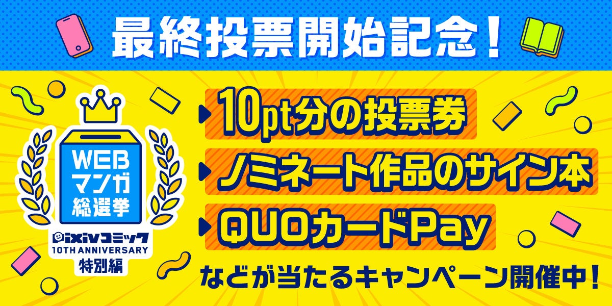「WEBマンガ総選挙 pixivコミック10周年 特別編」の最終投票開始を記念し、2つのキャンペーンを実施いたします。