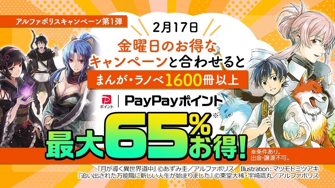 電子書籍販売サイト「ebookjapan」をヤフー株式会社と協力して運営する株式会社イーブックイニシアティブジャパンは、アルファポリスキャンペーン第1弾として男性向け作品を対象とした最大65%PayPayポイント還元キャンペーンを2023年2月17日(金)の1日限定で開催いたします。この機会にぜひ『月が導く異世界道中』や『追い出された万能職に新しい人生が始まりました』など大人気のアルファポリス作品をお楽しみください。