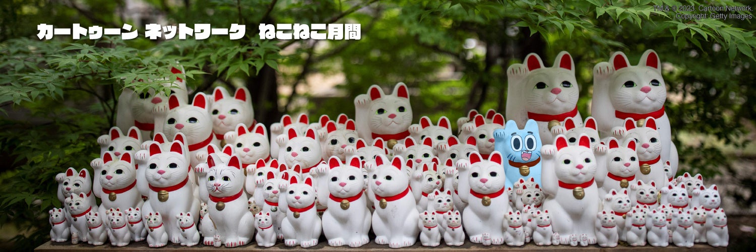 さまざまな招き猫のなかに、カートゥーン ネットワークで大人気のアニメ「おかしなガムボール」の主人公で猫の少年・ガムボールが紛れ込んでいます。しかし、体の色を消すことができず…。