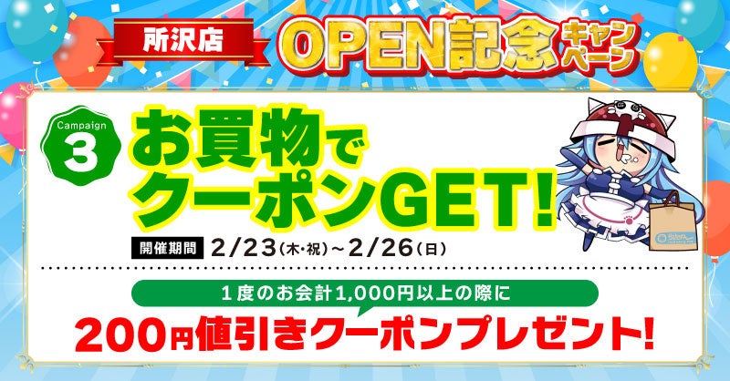 キャンペーン開催期間中、1,000円以上をお買い上げいただいたお客さまへ、所沢店にて2月27日よりご利用いただけます「2,000円以上200円引きクーポン」をお渡しいたします。