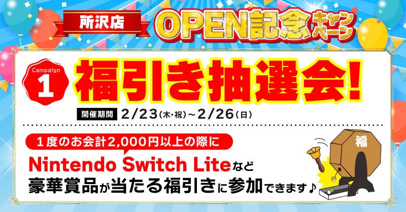 らしんばん所沢店にて、開催期間中に2,000円以上お買い上げいただいたお客さまに福引抽選券をお渡しいたします。抽選会の賞品は「Nintendo Switch Lite」や商品交換券などをご用意しております。