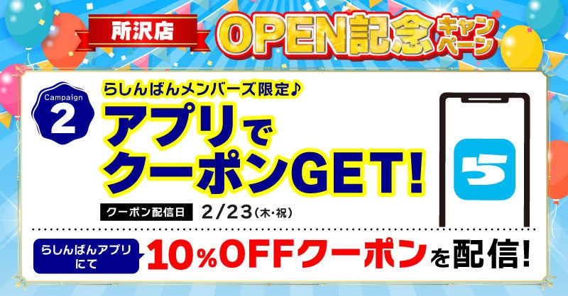 2月23日(木・祝)のオープン当日、らしんばんアプリにて、10%OFFクーポンを配信いたします。らしんばん所沢店でのお買い物で利用できるクーポンとなりますので、ぜひ店舗に足をお運びください。