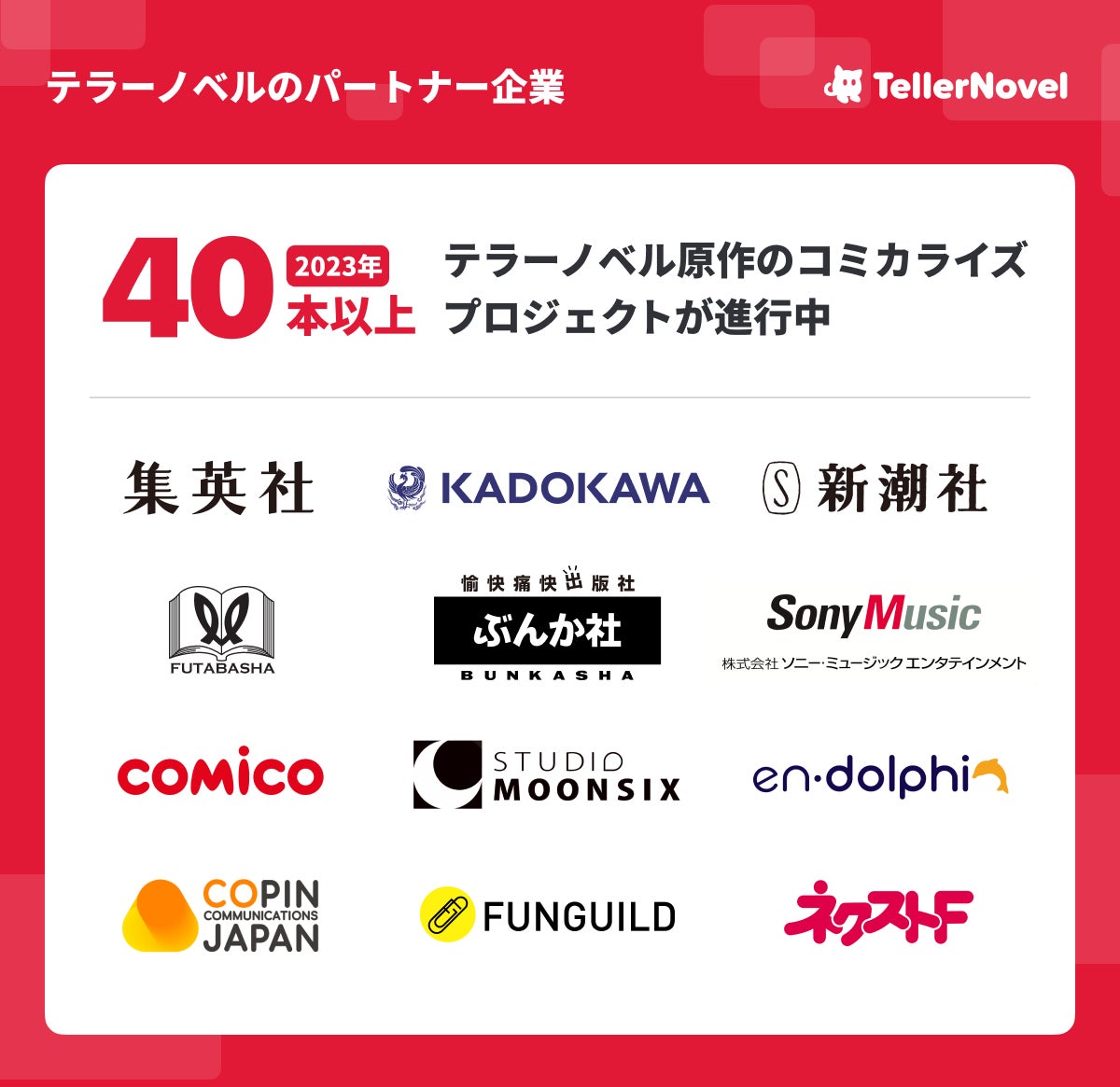 また大手出版社とともに、テラーノベルの原作を元にしたコミカライズプロジェクトも進行しており、集英社、KADOKAWA、新潮社、双葉社、ぶんか社、コミコ、ソニーミュージック等の大手出版社や大手ストアをパートナーとして、40以上のタイトルでWebtoonやコミカライズの制作を開始しています。