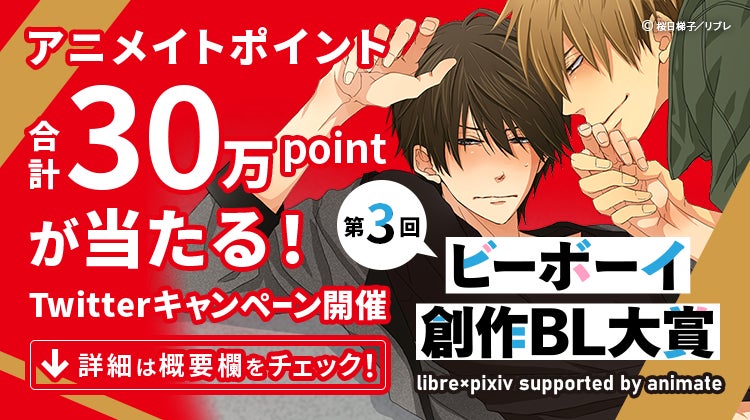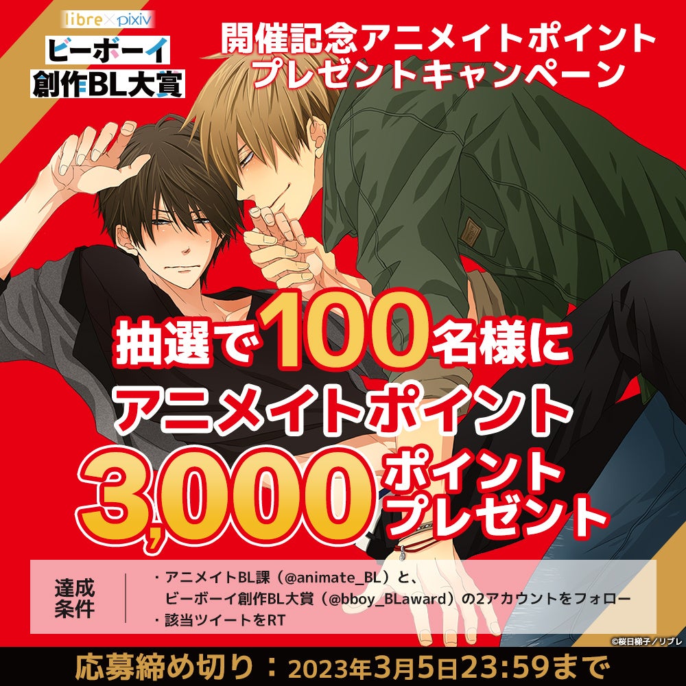 Twitterアカウント「アニメイトBL課(@animate_BL)」と「ビーボーイ創作BL大賞(@bboy_BLaward)」の2アカウントをフォロー&該当ツイートをRTで抽選で100名様にアニメイトポイント3,000ポイントプレゼント!