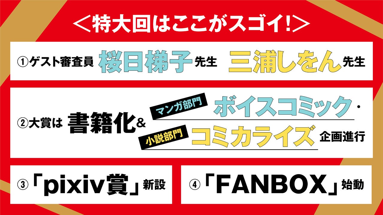 ①特別審査員に桜日梯子先生(マンガ部門)・三浦しをん先生(小説部門)をお迎え!
