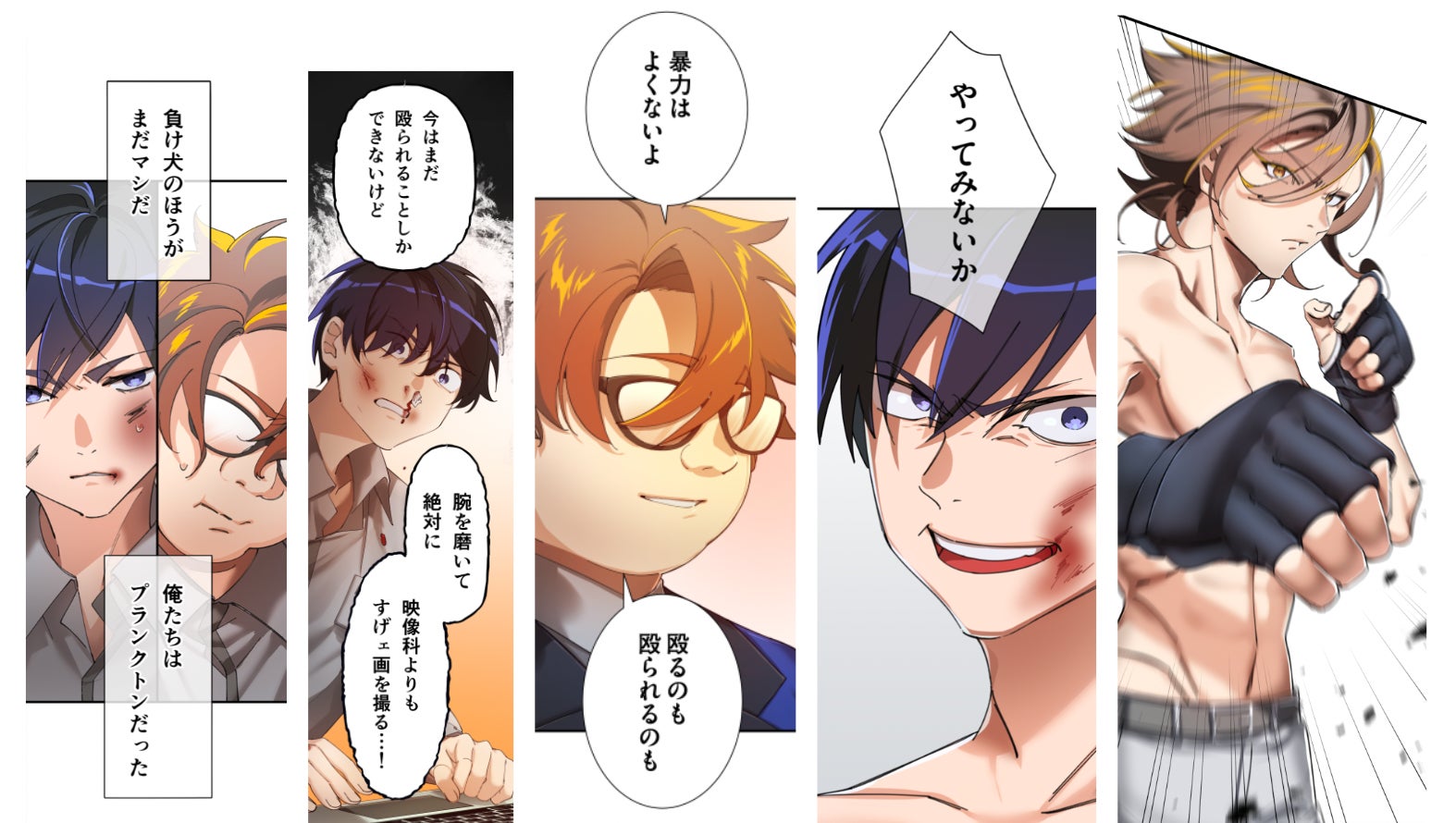 本作は2人のいじめられっ子の成り上がり物語であると同時に、その青春を描くバディものでもあります。貧弱だが勝ち気、撮影のためなら手段を選ばない監督・カット。気弱だが運動神経抜群、太りやすく痩せやすい俳優・アクト。様々な格闘技を使う強敵たちとの戦いの中で、彼らがどんなアクション映画を作り上げるのか? ぜひ最後までお楽しみ頂きたく思います。