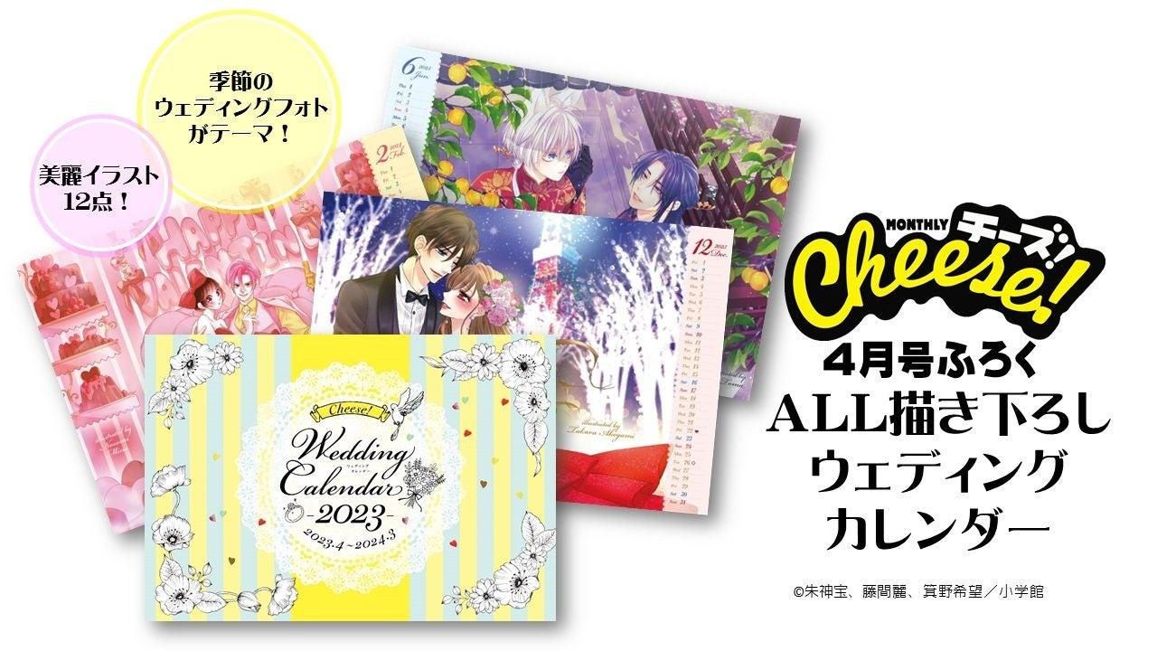 累計1000万部突破の人気連載『コーヒー&バニラ』(朱神宝)をはじめ、『王の獣』(藤間麗)、『薔薇と殺し屋』(箕野希望)など「Cheese!」の人気連載12作品による描きおろしイラストを収録した、4月始まりカレンダーがふろくに登場!イラストのテーマは「季節のウェディングフォト」!
