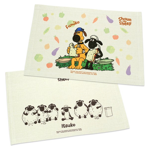 ベージュカラーのランチョンマット。麻のようなラフな表情のあるしっかりとした厚みのある生地。水洗いOK。モノトーンタッチのショーンと仲間たちがおしゃれなデザインと、カラフルな野菜柄の背景にショーンとビッツァーがサンドイッチを食べている可愛らしいデザインの2種。名入れありは、アルファベットでお名前を入れることができます。