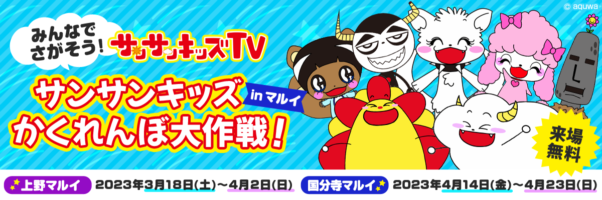 株式会社aquwa(本社:東京都渋谷区 / 代表取締役:佐々木 和哉)の運営するファミリー向け人気YouTubeチャンネル「サンサンキッズTV」(https://www.youtube.com/user/anpankidstv/featured)が上野マルイ・国分寺マルイにて3月、4月にイベント「みんなでさがそう!サンサンキッズかくれんぼ大作戦!in マルイ」を開催することをお知らせいたします。