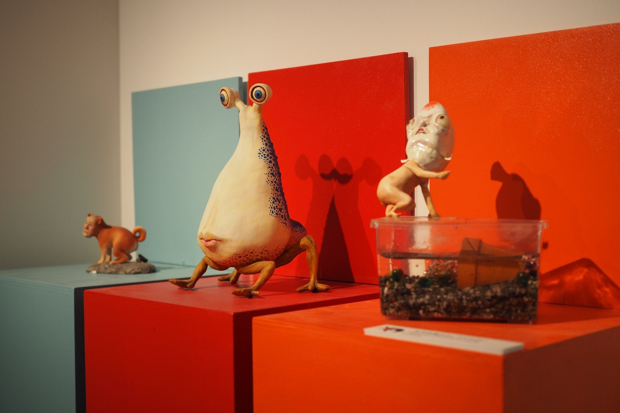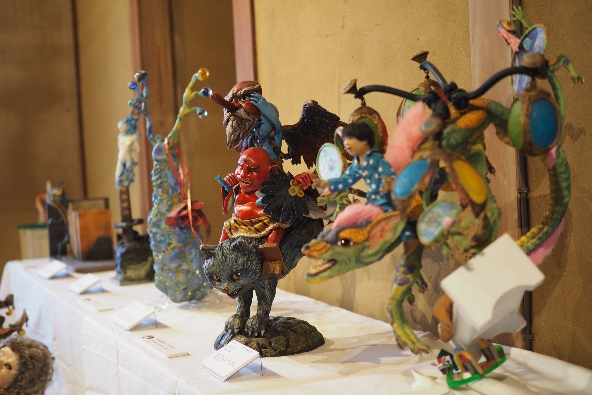 妖怪美術館で展示している立体造形作品は、2013年(第1回)から2018年(第5回)までに応募された全作品で累計828点あります。作者は模型やフィギュア製作が好きな方、美術系の学生、などアマチュアをはじめプロの造形作家など多彩で、年齢は3歳から83歳、地域は北海道から沖縄、そして一部台湾や香港からの応募作品もあります。「妖怪」の立体造形作品であればなんでもOKで、応募作品のほとんどがオリジナル。現代の感覚で生まれた多種多様で個性的な妖怪がアート作品として集積しています。