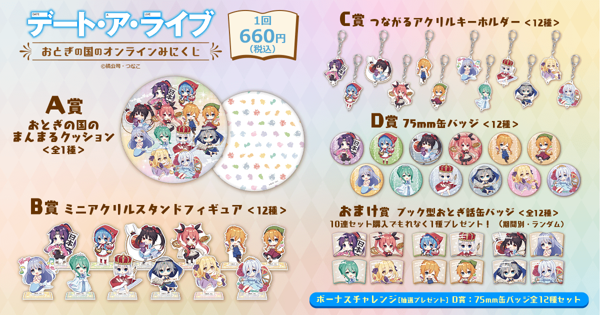 株式会社KADOKAWA(本社:東京都千代田区、代表取締役社長:夏野 剛 以下KADOKAWA)は、運営するオンラインくじサービス「くじ引き堂」において、『デート・ア・ライブ』描き下ろしminiキャラのオリジナル商品が手に入る<デート・ア・ライブ おとぎの国のオンラインみにくじ>を、2023年3月7日(火)12時より販売します。