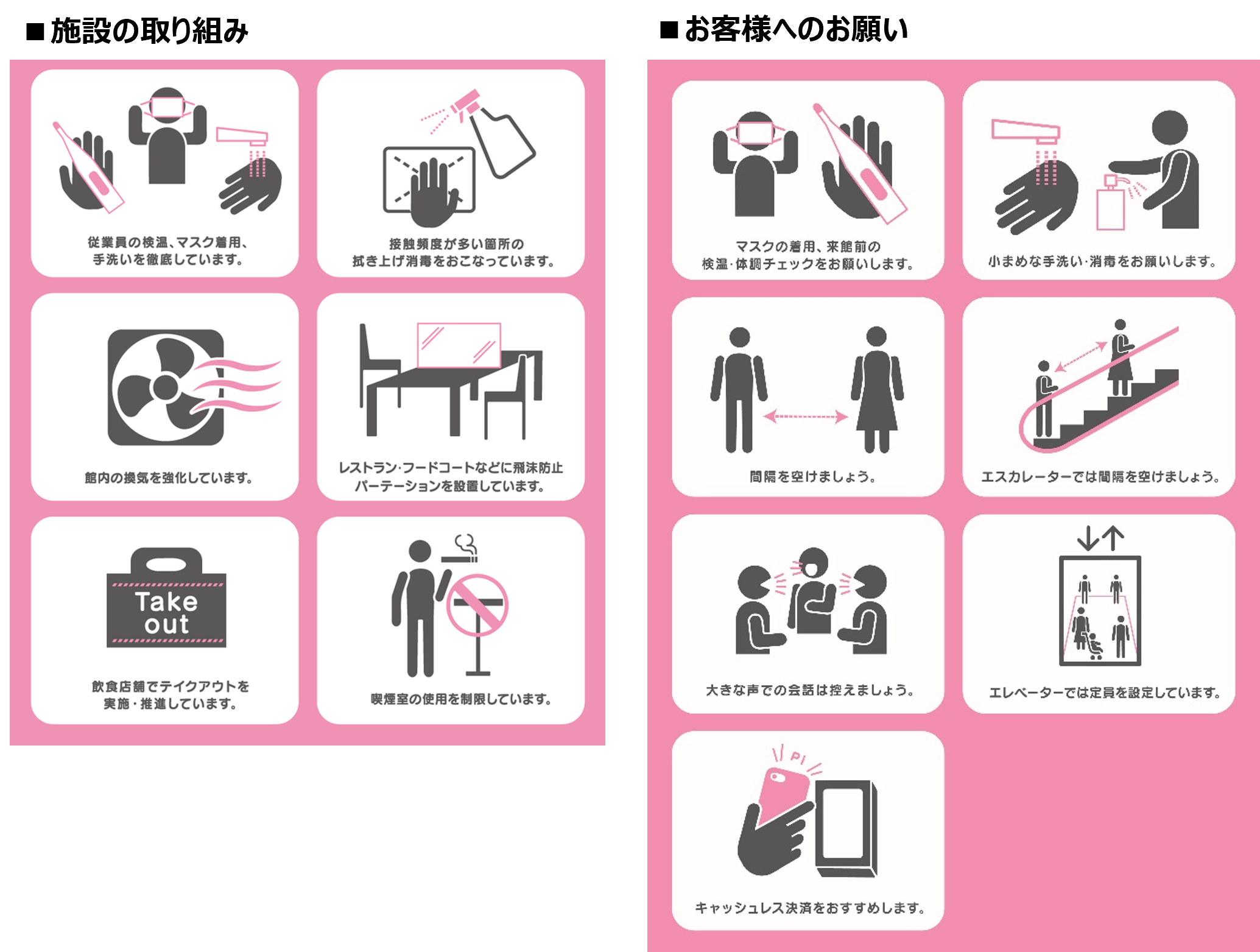 三井不動産グループが運営する商業施設では、新型コロナウイルス感染拡大防止のため、下記をはじめとした様々な取り組みを実施しております。
