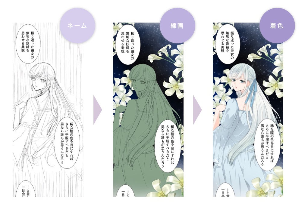 受賞作品については、分業制作を専門とする「comico」のコミカライズチームが、ネーム・線画・背景・着色の工程をチェックし、責任をもってディレクションいたします。