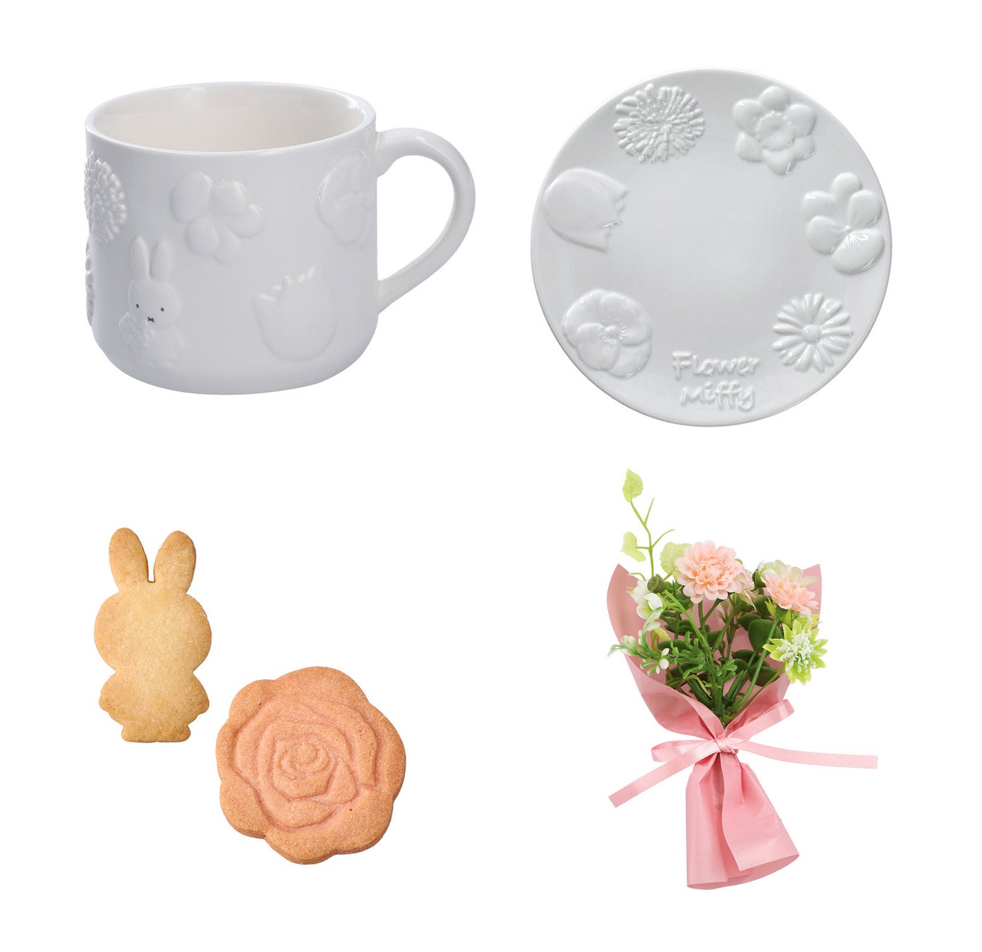 セット内容:フラワーレリーフカップ&プレート、フラワーミッフィークッキーBOX、アートフラワーミニブーケ