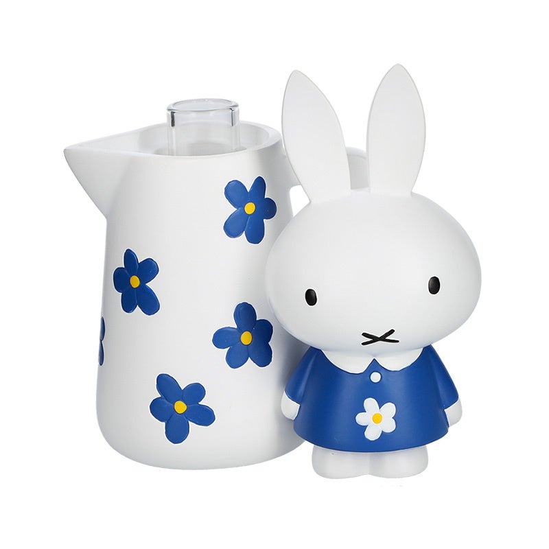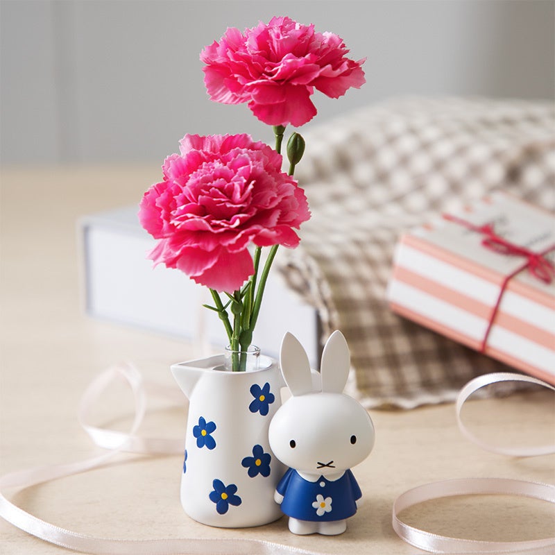 お花柄のミルクポットの側にちょこんとたたずむミッフィーがかわいらしい一輪挿しに、カーネーションのアートフラワーを2輪セットしてお届けいたします。手のひらサイズの一輪挿しで、玄関やキッチン、会社のデスクなど様々な場所に飾っていただけます。