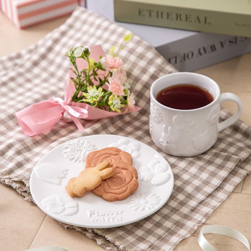 ブルーナさんの描いたお花をレリーフにした、シンプルで高級感のあるマグカップとプレート、ミッフィーとお花の形のクッキーとアートフラワーのミニブーケをセットでご用意いたしました。お花とともにいつもより特別感のあるティータイムをお楽しみいただけます。