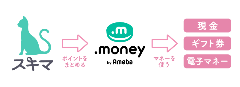 スキマで貯めたポイントは1ポイント=1円相当で、スキマ内でコインの代わりに使用できる他、各種電子マネー、各種ギフト券、銀行振込を通した現金など50種類以上の多種多様なサービスと手数料無料で交換することができます。