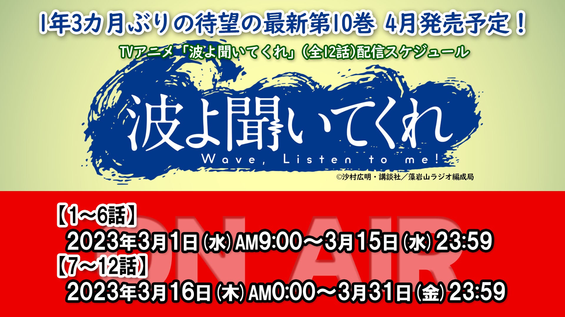 沙村広明の漫画「波よ聞いてくれ」最新第10巻が4月21日に発売予定!これを記念して、講談社が運営するYouTubeチャンネル「フル☆アニメTV」にて、TVアニメ「波よ聞いてくれ」全12話を無料配信いたします。【第1話~第6話】を本日3月1日から3月15日まで、【第7話~第12話】を3月16日から3月31日までの期間限定配信となりますので、原作コミックスと一緒にぜひお楽しみください!