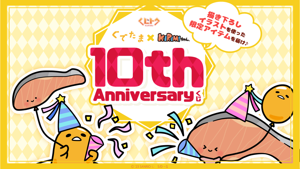 2023年でデビュー【10周年】を迎えた、ぐでぐでやる気のないたまご『ぐでたま』、おいしく食べてもらいたい…という想いで産まれてきた『KIRIMIちゃん.』が特別コラボしたくじとなっております。【10周年】を記念したオリジナル描き下ろしデザインを使用した、ここだけでしか手に入らない可愛いアイテムが盛りだくさんです。