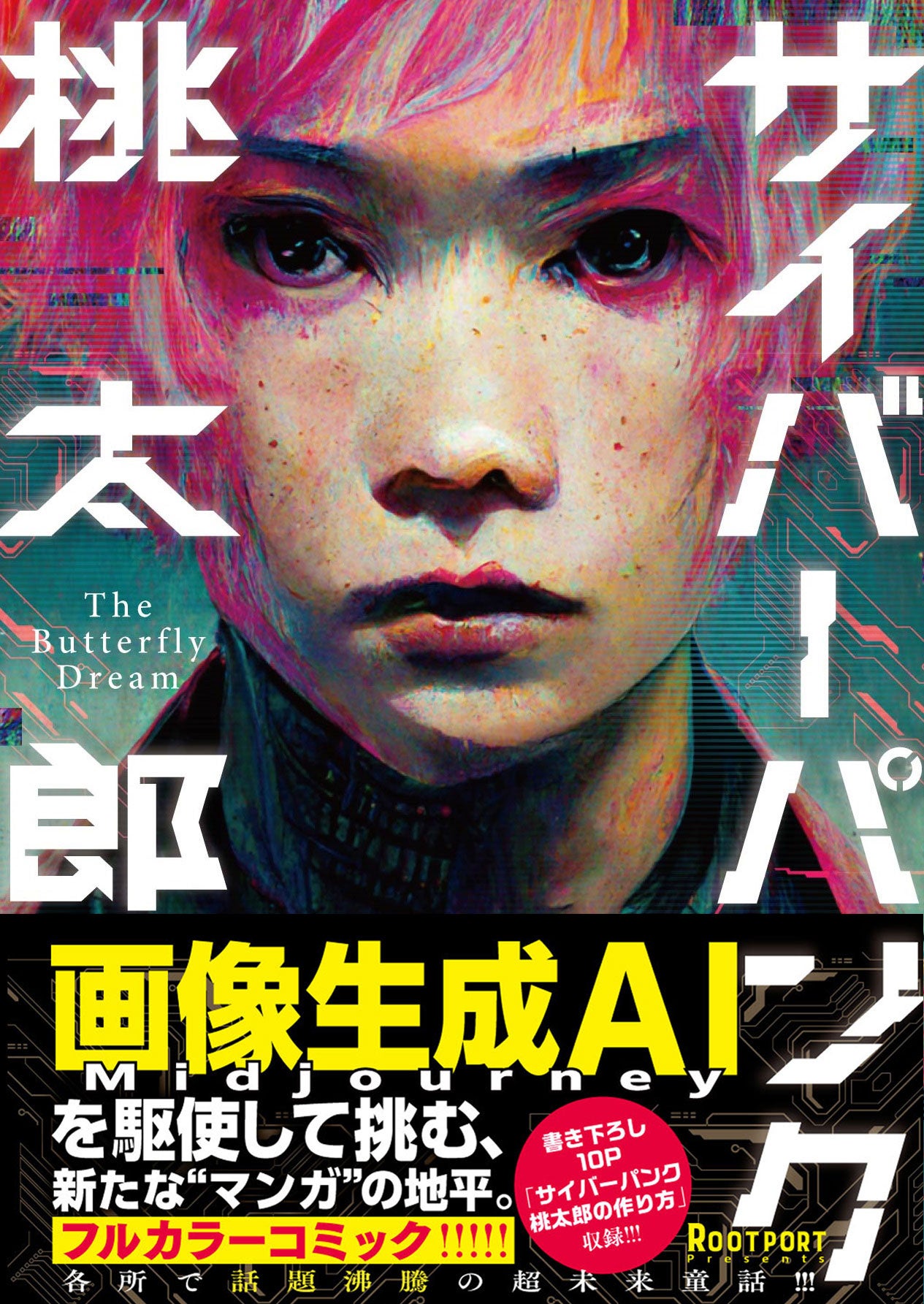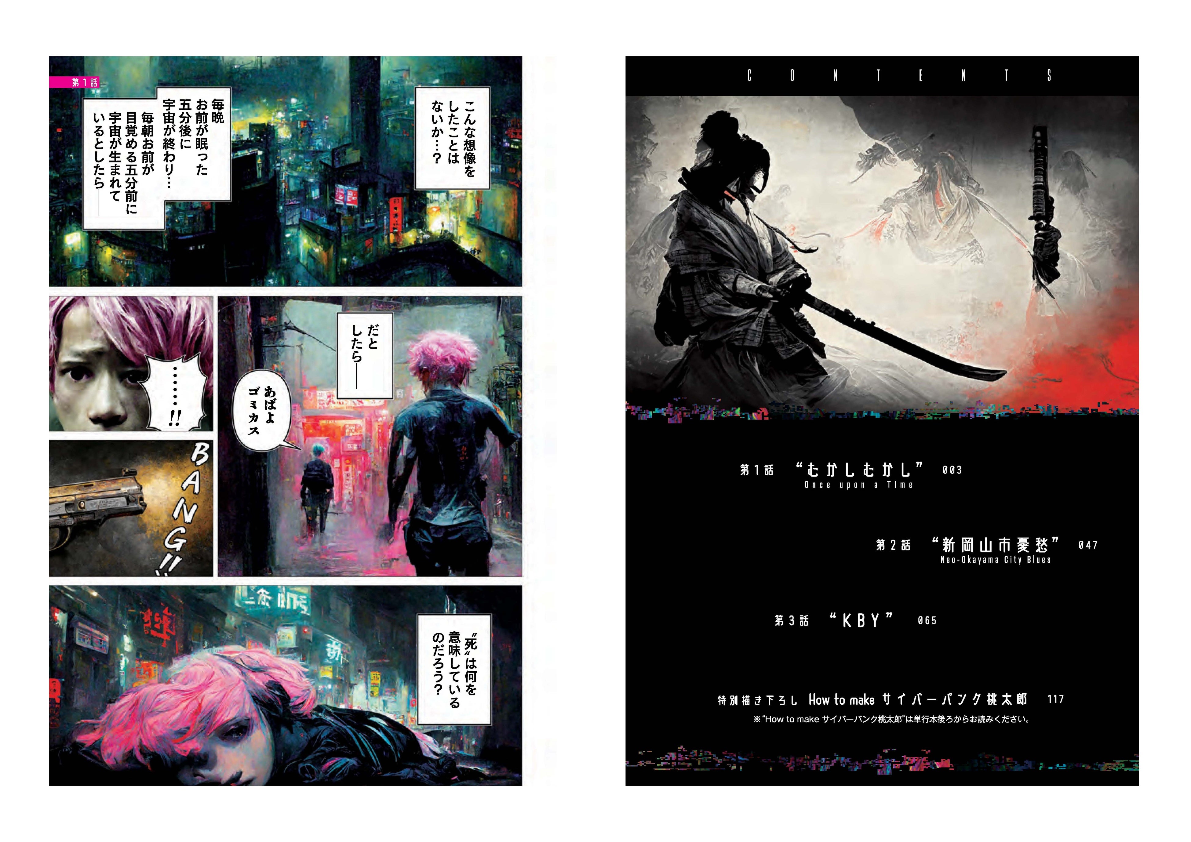 『サイバーパンク桃太郎』は話題のAI画像生成ソフトを駆使して作られた初の本格SFコミック。書籍にはTwitter公開版の加筆修正のほか、画像生成AI「Midjourney」の基本的な使い方、マンガを作る上でのポイントなどをわかりやすく解説した10Pの書き下ろしを収録。さらに電子書籍限定で「物語の作り方」に言及した追加書き下ろしを収録予定です。