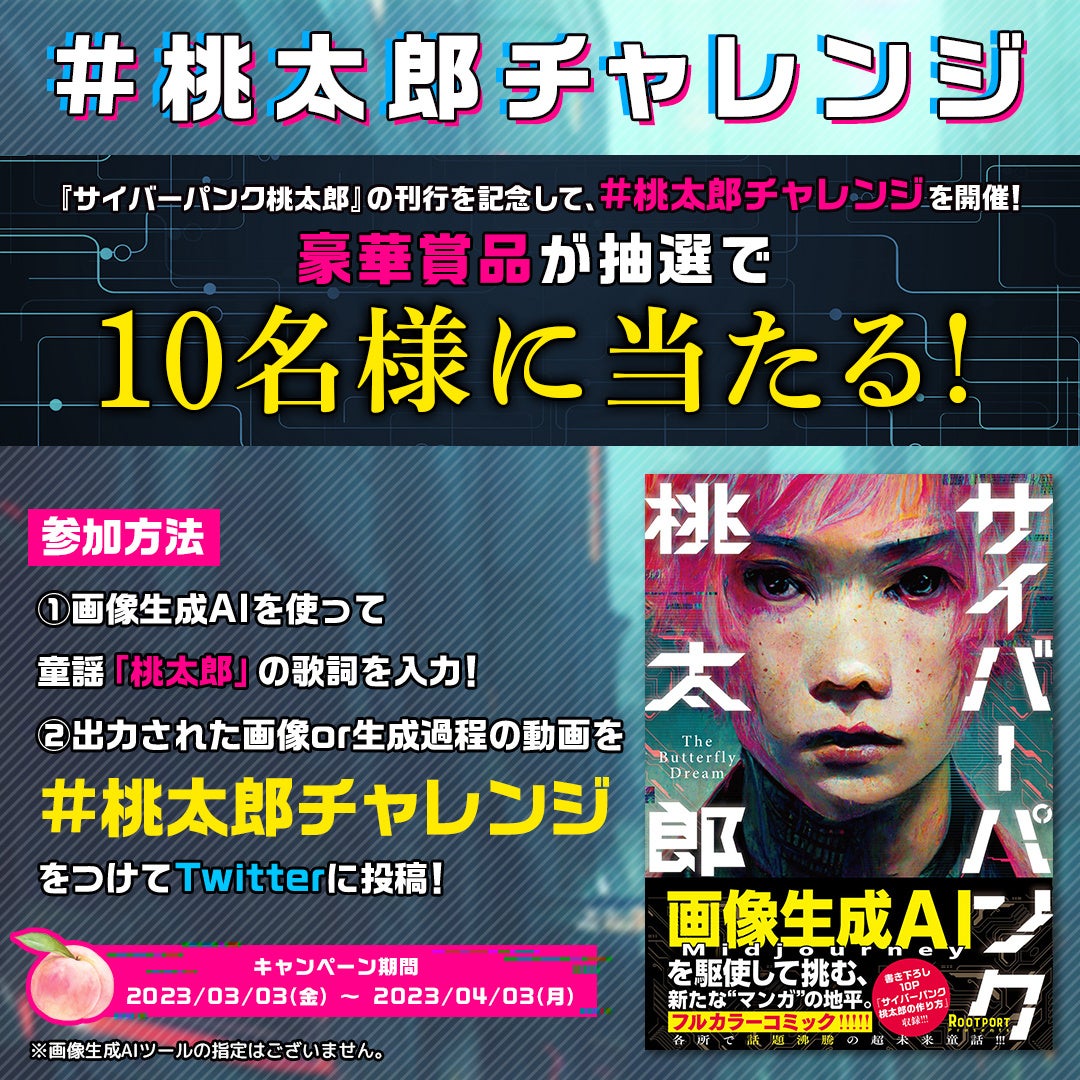 AI画像生成ソフト「Midjourney」を駆使して描かれ、3月9日に新潮社バンチコミックスより刊行が決定しているフルカラーコミック『サイバーパンク桃太郎』(著・Rootport)。NHK『令和ネット論』・日テレ『news zero』・テレ東『WBS(ワールドビジネスサテライト)』ほか各種メディアで注目を集めている本作の刊行を記念して、2023年3月3日より「#桃太郎チャレンジ」と題したTwitterプレゼントキャンペーンを実施いたします。画像生成AIに童謡『桃太郎』の歌詞を入力し、生成された画像を「#桃太郎チャレンジ」とともに投稿。抽選で10名様にNintendo switchほか豪華賞品が当たります。