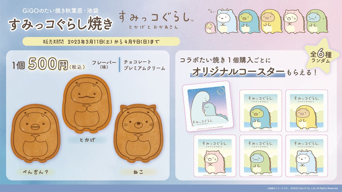 すみっコぐらし焼き 1個(500円税込)ご購入につき、ランダムでコースターを1枚プレゼントいたします。