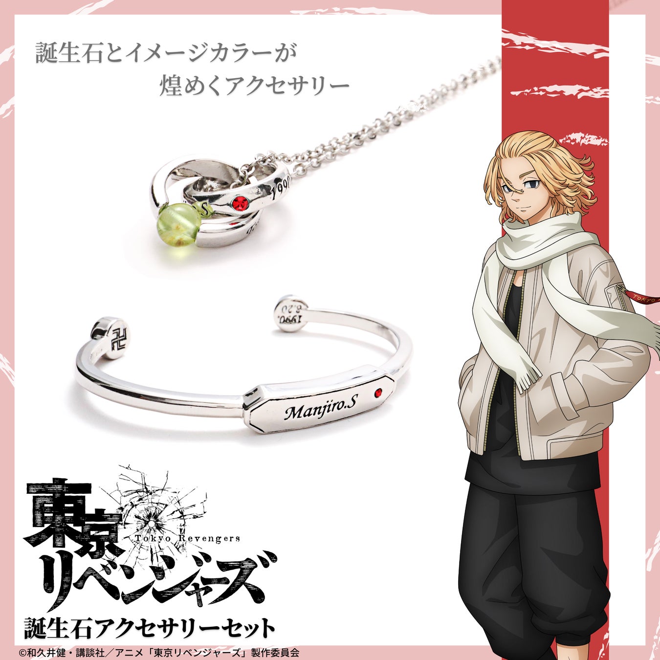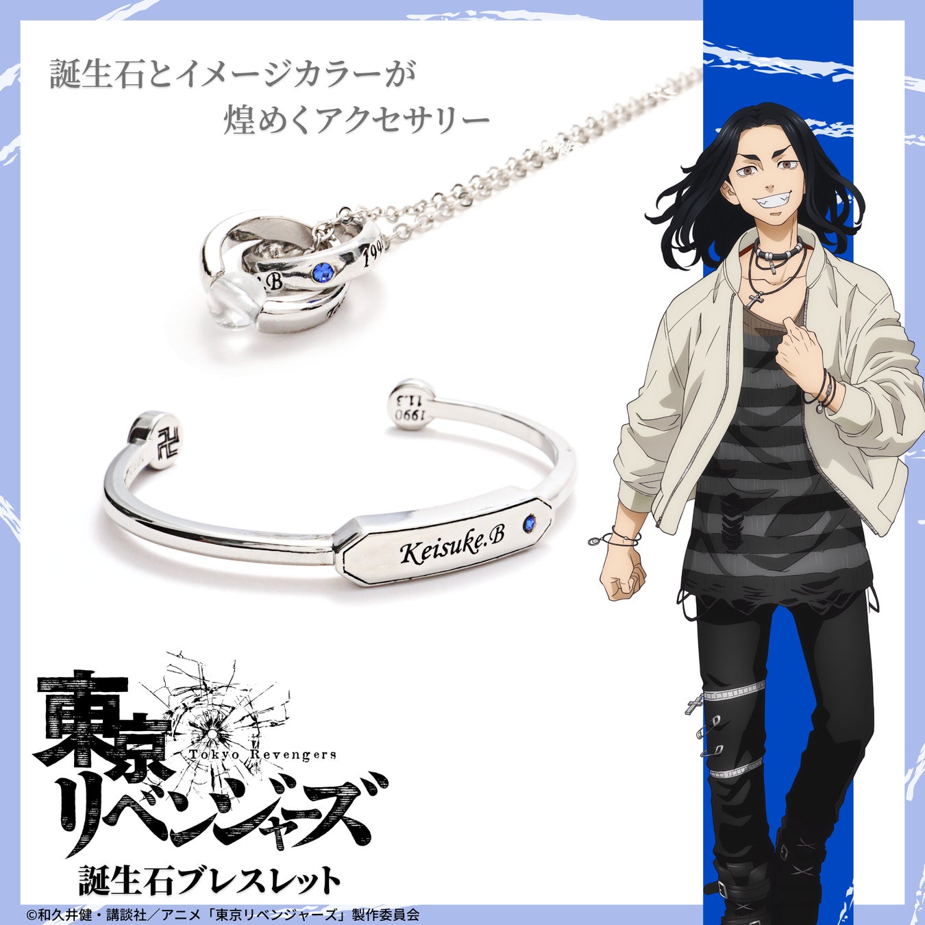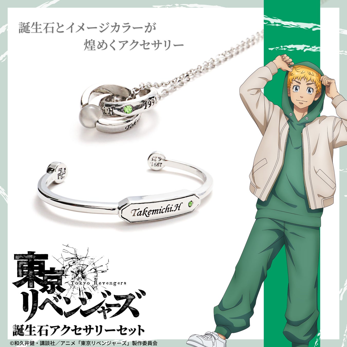 TVアニメ『東京リベンジャーズ』アクセサリーは、キャラクターの誕生石を使用した「誕生石ネックレス」「誕生石ブレスレット」と、ポップなデザインが可愛い「イヤカフリング」の3種をラインナップ。
