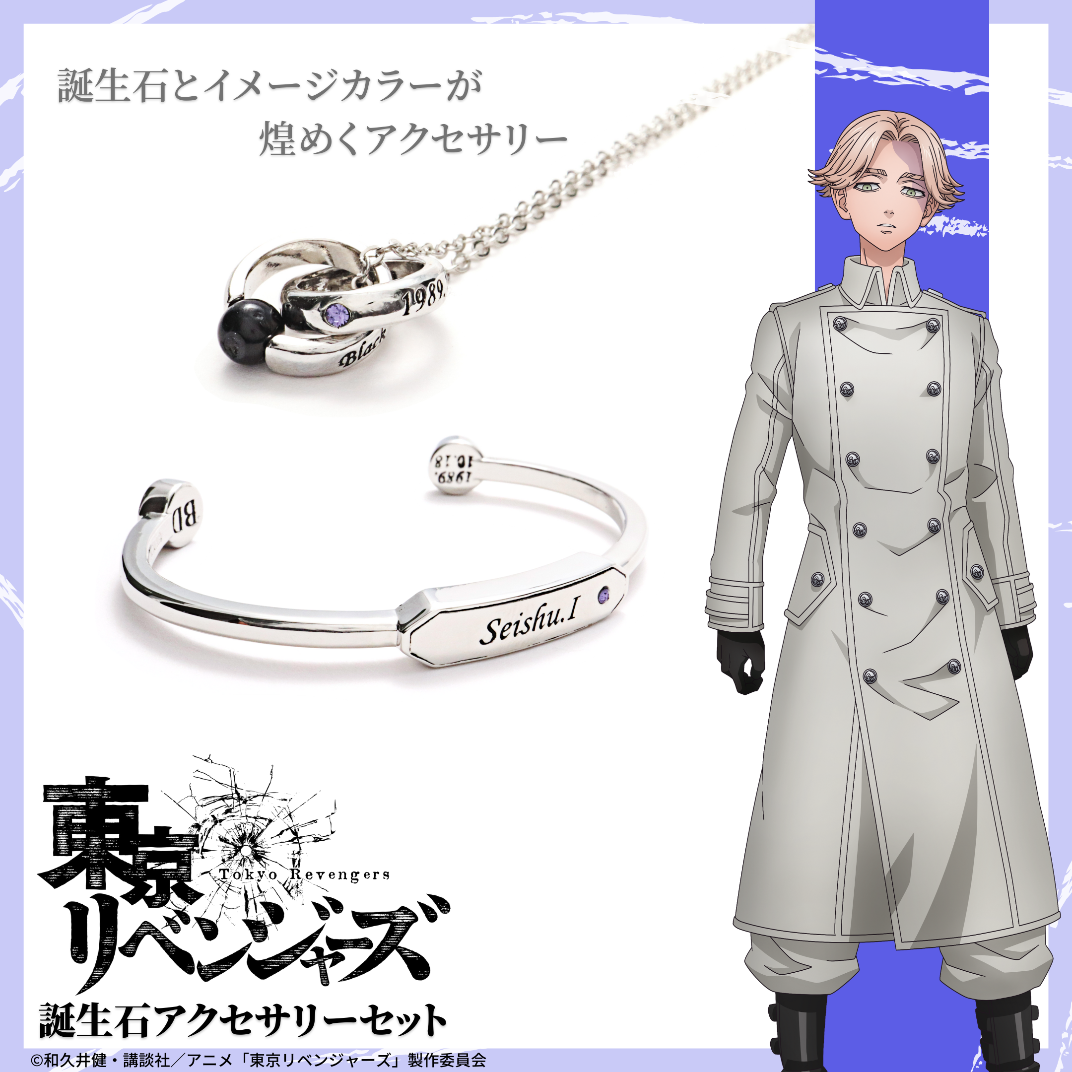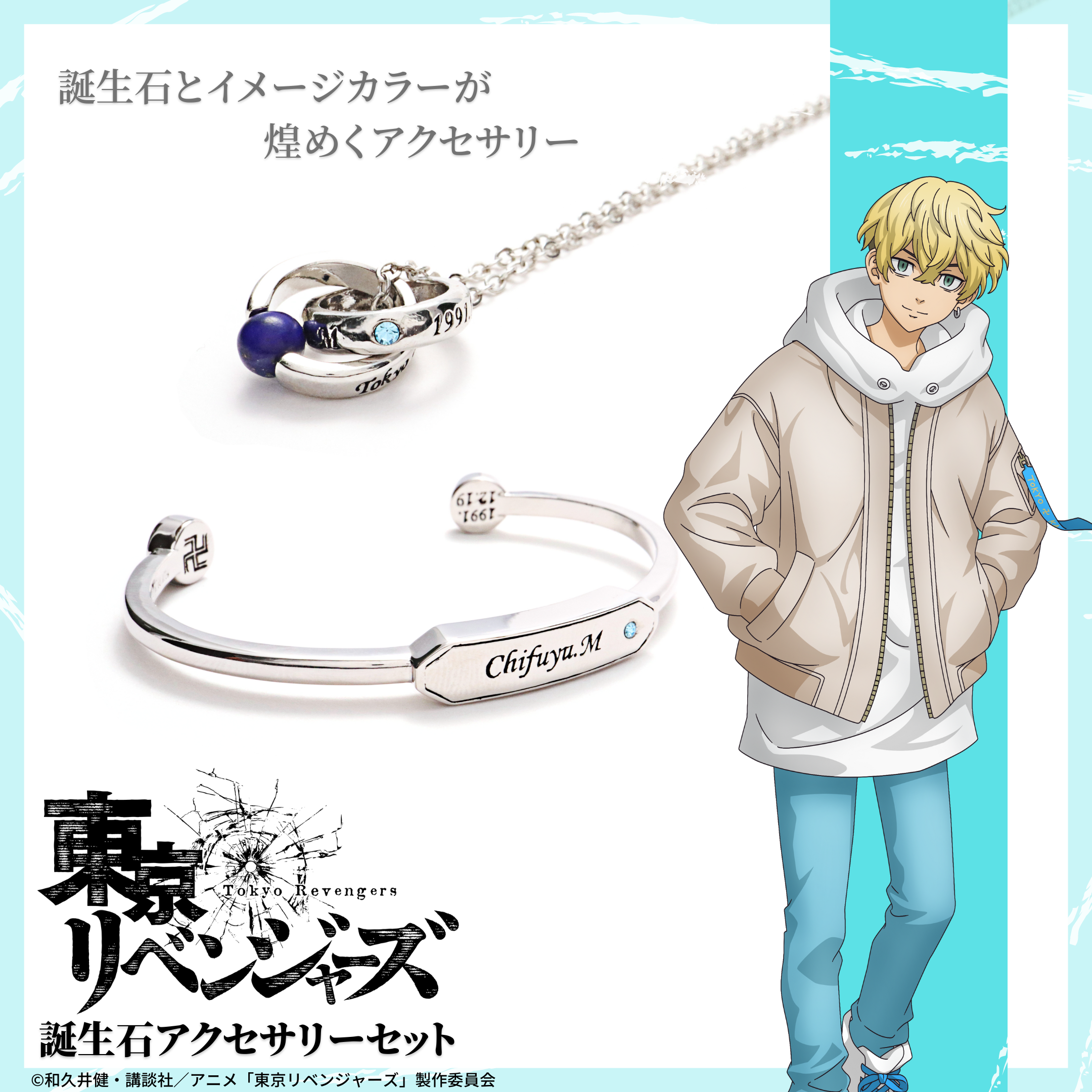 TVアニメ『東京リベンジャーズ』アクセサリーは、キャラクターの誕生石を使用した「誕生石ネックレス」「誕生石ブレスレット」と、ポップなデザインが可愛い「イヤカフリング」の3種をラインナップ。