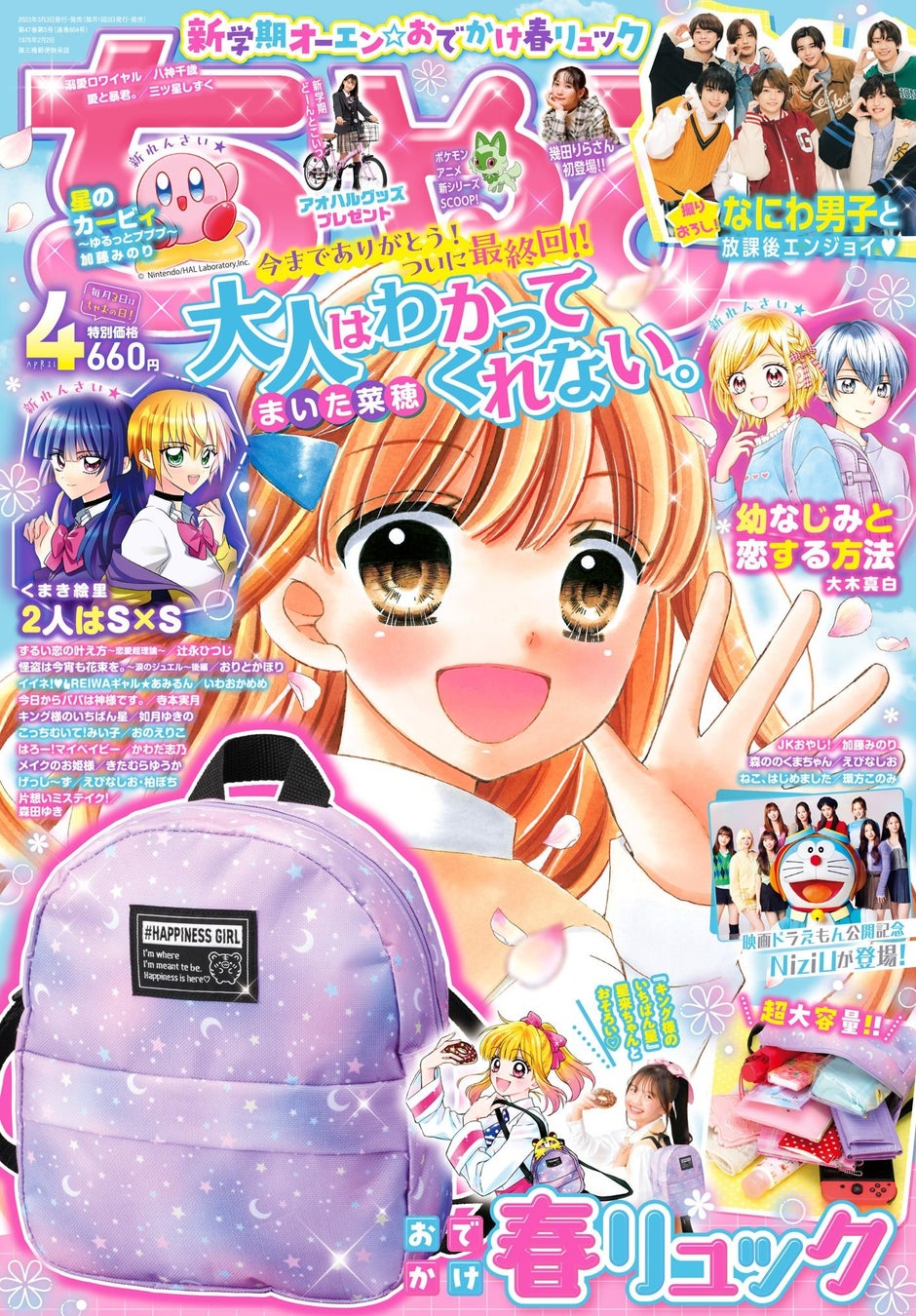 今号は、『大人はわかってくれない。』(まいた菜穂)が最終回スペシャルで表紙&巻頭カラーに登場。ドキドキのクライマックスをチェックしてください! さらに、『幼なじみと恋する方法』(大木真白)と『2人はS×S』(くまき絵里)に加えて、『星のカービィ』(加藤みのり)の新連載がスタート! お洒落付録に、読み応えたっぷりのまんがが盛りだくさんの「ちゃお」4月号をお楽しみください!