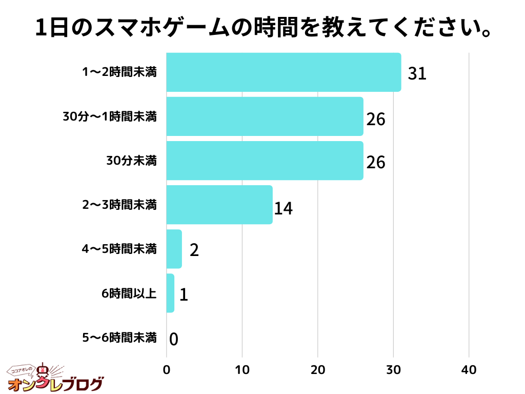 「1日のスマホゲーム時間の時間を教えてください。」アンケート調査した結果、1位は『1〜2時間未満』でした。