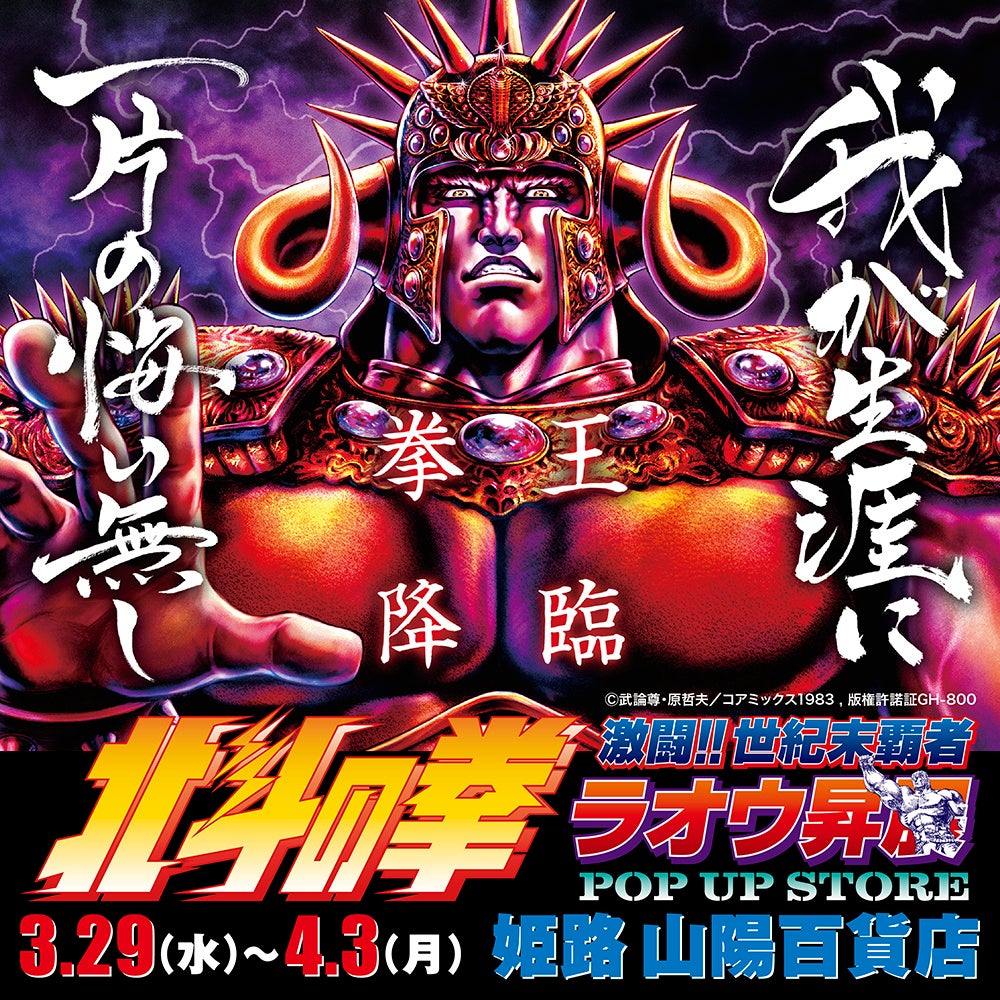 マンガ、アニメ、特撮などを始めとするサブカルチャーをテーマとした企画展を開催・運営している株式会社クレイジーバンプは2023年3月29日(水)より兵庫県姫路市 姫路山陽百貨店にて開催する【北斗の拳〜激闘!!世紀末覇者ラオウ昇展〜 POP UP STORE】の情報を公開致します。