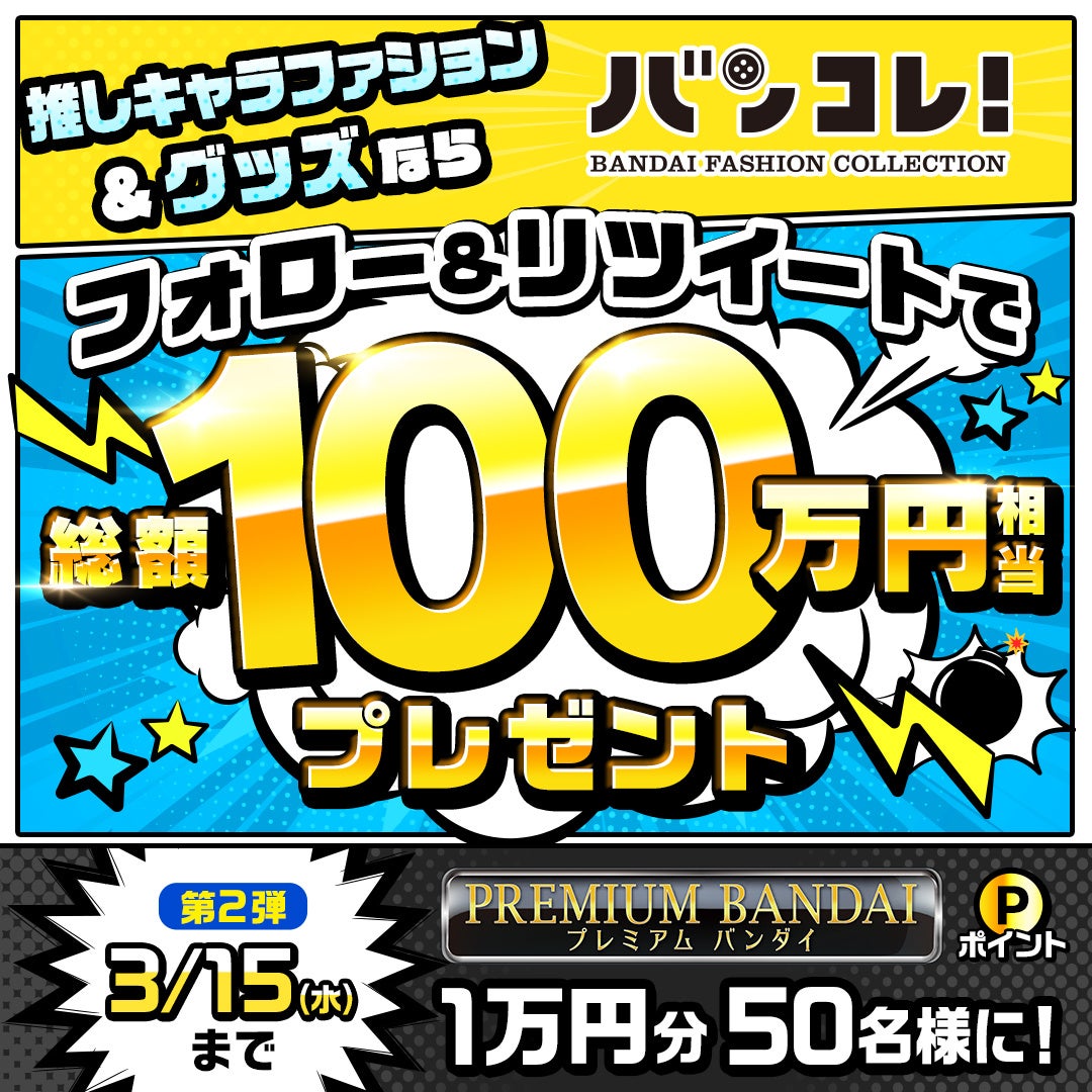 株式会社バンダイ ファッションブランド事業部では、バンダイのキャラクターファッションアイテムや雑貨などのグッズを取り扱うショップ『バンコレ!』公式Twitterアカウント( https://twitter.com/BANDAIFN )にて、プレミアムバンダイで使えるプレバンポイント総額100万円!が当たる「目指せフォロワー10万人!『バンコレ!』を知ってくれ!Twitterキャンペーン」の第二弾を2022年3月6日(金)より開始いたします。第一弾、第二弾合わせて総額100万円分のプレミアムバンダイポイントを抽選で合計150名様にプレゼントいたします。