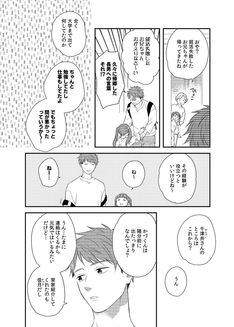大学卒業後に、幼馴染み一家が経営する老舗旅館でアルバイトをすることになった大は、そこで弟のように可愛がっていた朔史郎と再会する。朔史郎は父を早くに亡くし、兄の佳月は行方知れずになったままで、病弱な母を支えて当主として頑張っていた。