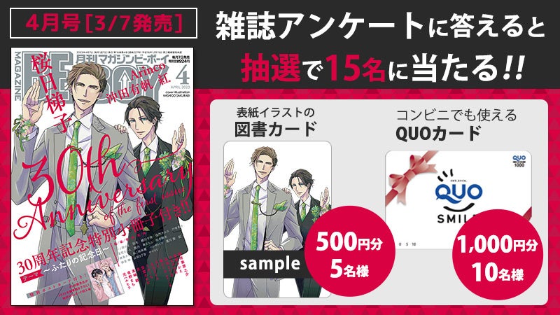株式会社リブレ(本社:東京都新宿区、代表取締役社長:太田歳子)は、桜日梯子先生が表紙の雑誌「マガジンビーボーイ2023年4月号」を3月7日に発売いたします。https://www.b-boy.jp/magazine/204447