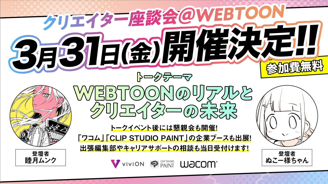 株式会社viviON(所在地:東京都千代田区、代表取締役:明石耕作)は、3月31日(金)にWEBTOONをテーマに、クリエイターとクリエイターを目指す学生に向けたイベント『クリエイター座談会@WEBTOON』を秋葉原で開催いたします。