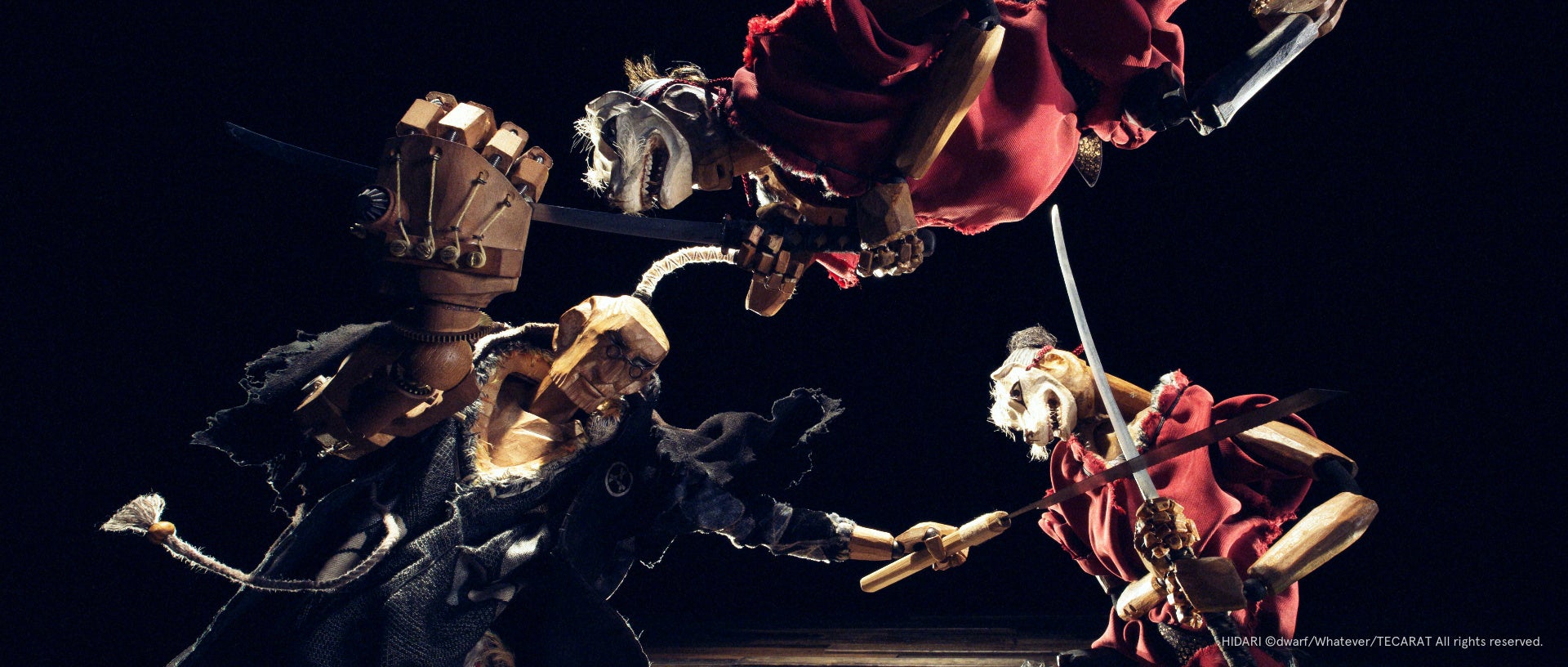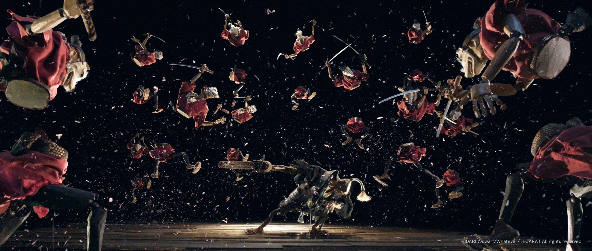 彫った動物に命を吹き込むという逸話が残る左甚五郎。その逸話をなぞるように、本作の人形は全て木彫で作られ、映像の魔法を使って命を吹き込んでいます。木彫のテクスチャを活かしたキャラクターや義手のデザインはもちろんのこと、斬られた時の血の代わりに「おがくず」が吹き出すといった、木ならでは素材感を活用した演出も発明し、独自の映像美を作りだしています。