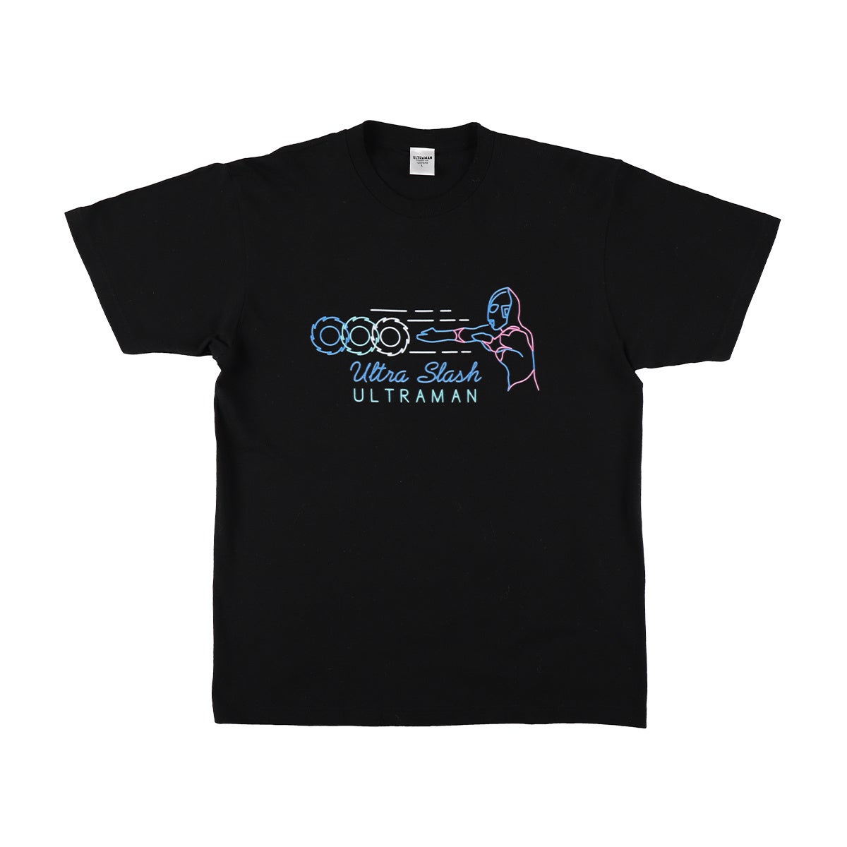 ウルトラマンが八つ裂き光輪を投げるポーズをネオン柄が生える黒地にデザインしました。