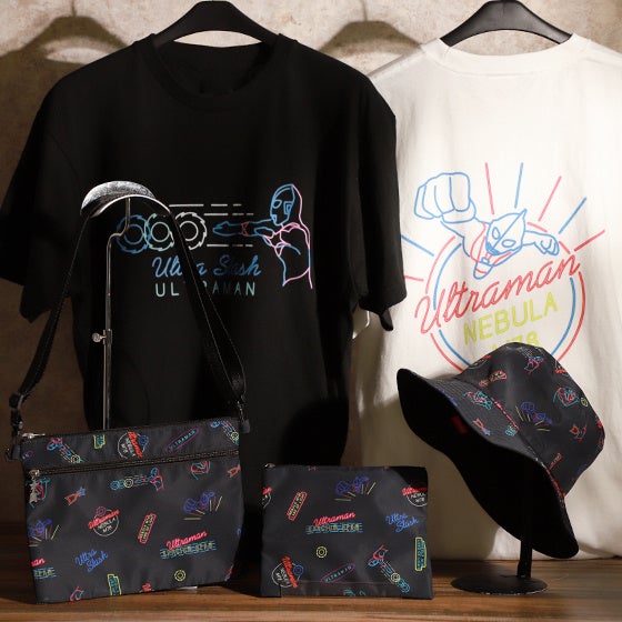 ウルトラマンや流星マークなど作品を象徴するアイコンたちを、夜に輝くネオンサイン風のポップでカラフルなデザインで表現したアパレル雑貨シリーズです。ラインアップは、ウルトラマンが八つ裂き光輪を投げるポーズがデザインされた「UltraSlash」、ウルトラマンが飛び出すポーズのデザイン「Nebula」をあしらったTシャツ2種と、総柄と黒無地の両方で楽しめる「リバーシブルハット」、ファスナーの引き手が流星マークになっている、遊び心溢れる総柄の「ポーチ」と「サコッシュ」の全5種類の展開です。