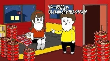 舞台となる部屋には、一人の女性が座っています。用事を済ませて戻ってきた男性は、部屋の中に漂う濃厚なソースの香りに気付き、「日清焼そば U.F.O.」を黙って食べたのではないかと女性を問い詰めます。女性は口のまわりにソースをつけながらも、自分の香水の香りだと言い張りますが、ソースのフレグランスなどあるはずないとツッコむ男性。女性は「U.F.O.は魅力的」と認めながらも食べたことを否定し続けますが、男性のさらなる追求に「ヤバい組織に脅されて食べた」と告白し、その組織が“日清”であることを暴露して男性を驚愕させます。