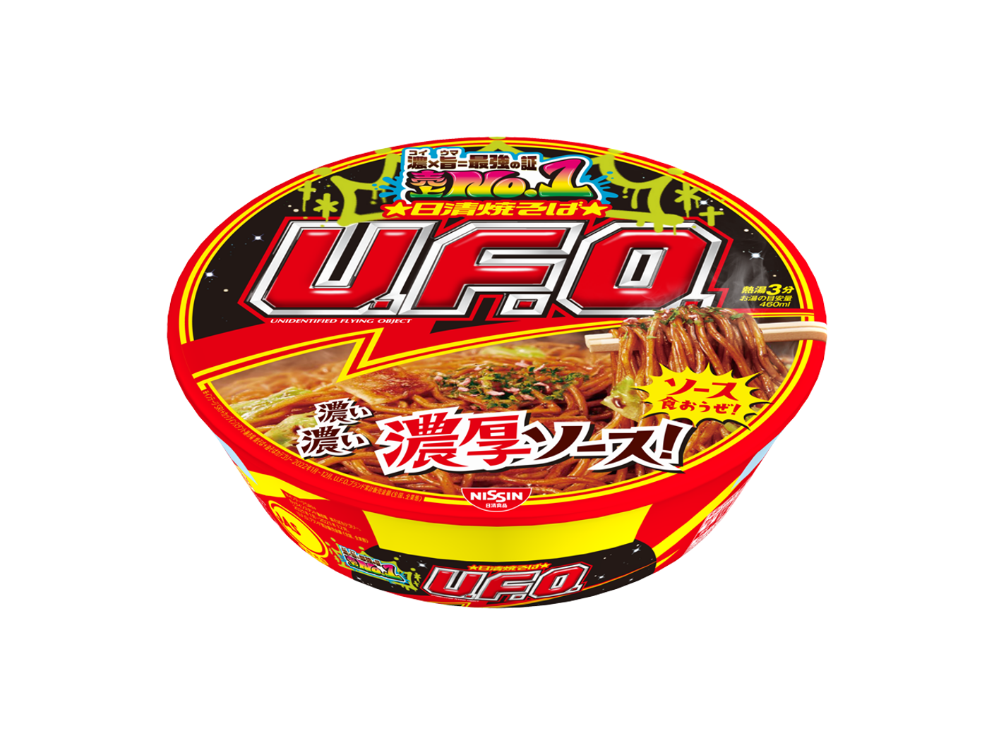 旨さを凝縮した“濃い濃い濃厚ソース”は、焼そばを鉄板で炒めたときの香ばしいロースト感を再現しました。「ソースが食いたい!」そんな時に心もお腹も満たされる濃厚なカップ焼そばです。商品名の「U.F.O.」は、商品特長である「うまい(=U)ソース、太い(=F)麺、大きい(=O)キャベツ」を表しています。